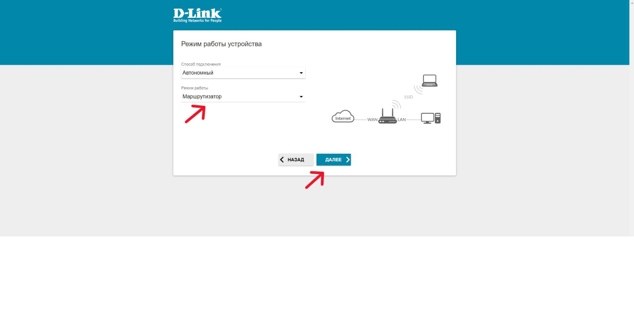 4. На следующем экране вам необходимо выбрать в поле «Режим работы» параметр «Маршрутизатор» и нажать кнопку «Продолжить».