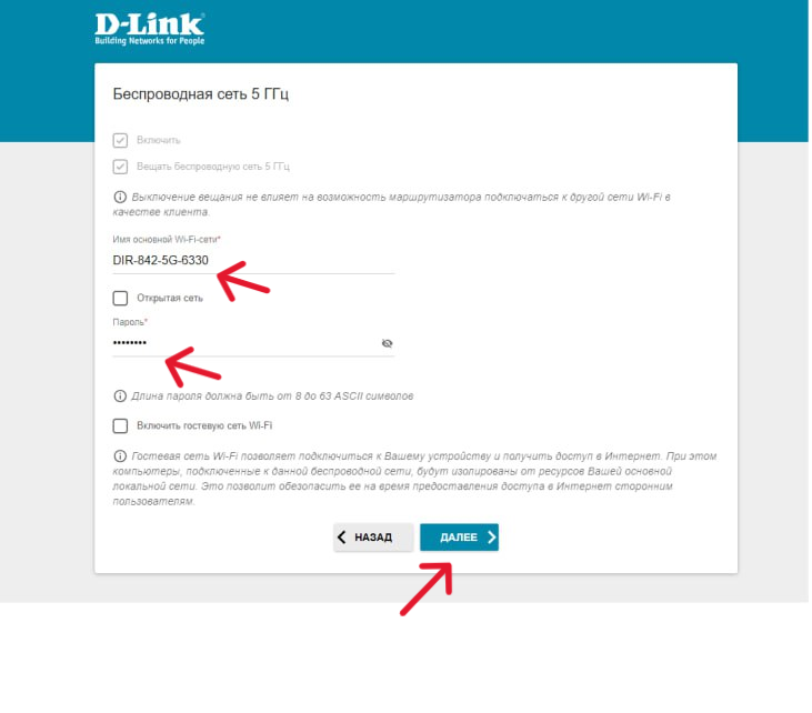6. Следующим шагом является установка наименования и пароля Wi-fi сети, данный роутер поддерживает несколько диапазонов частот, (2.4 Ггц и 5 Ггц) поэтому вам потребуется ввести данные для обеих сетей.