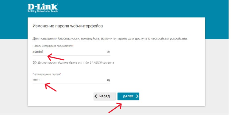 9. Следующим этапом вам потребуется ввести новый пароль для входа в настройки и подтвердить его, после это нажмите кнопку «Далее».