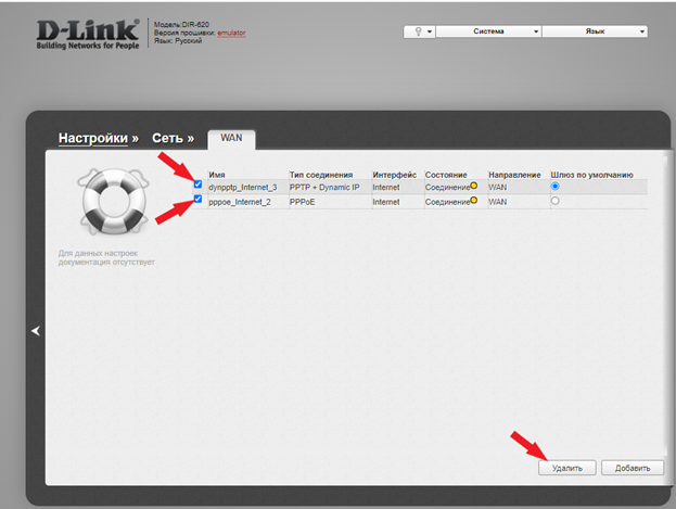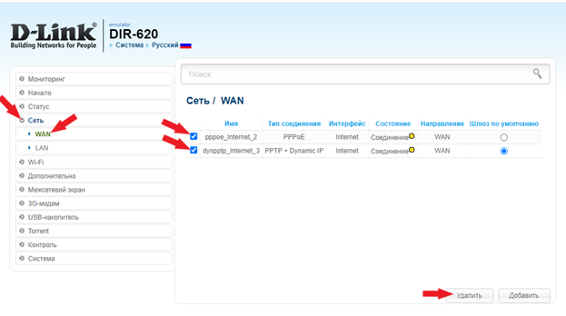 Шаг 4. Откройте список «Сеть», перейдите во вкладку «WAN», перед Вами список созданных ранее соединений, выделите все и нажмите на кнопку «Удалить»;