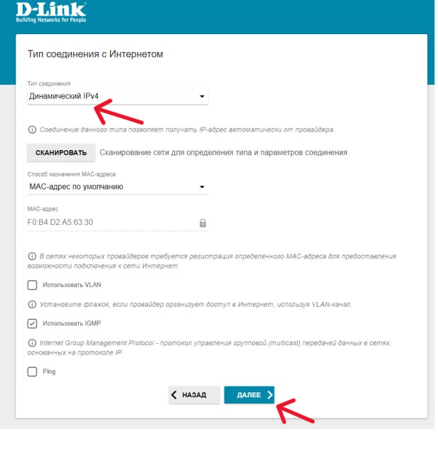 Введя данные о типе подключения нажмите кнопку «Далее».