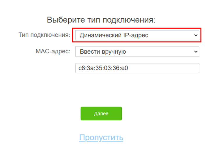 Шаг 2. Выберите из выпадающего списка в «Тип подключения» – «Динамический IP-адрес», «Mac-адрес» – «По умолчанию», нажмите «Далее»