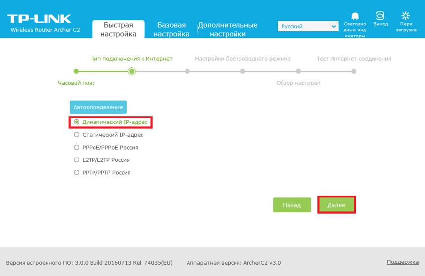 Шаг 4. Выберите тип подключение «Динамический IP-адрес», нажимаем кнопку «Далее»;