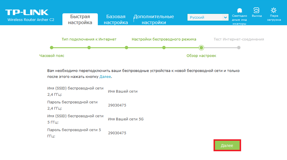 Выберите имя и пароль для беспроводных сетей и нажмите «Далее»;