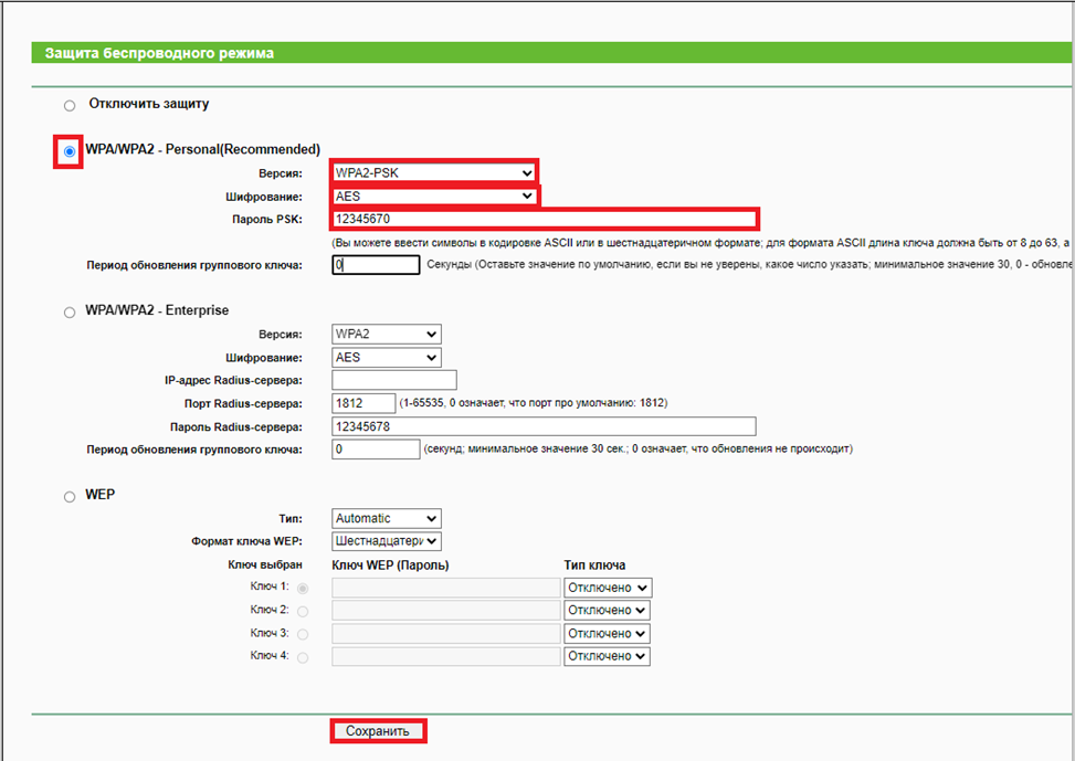 Шаг 3. Для смены пароля перейдите во вкладку «Защита беспроводного режима», если требуется открытая сеть (без пароля) выберите пункт «Отключить защиту». Для зашиты сети паролем выберите WPA/WPA2 – «Personal»