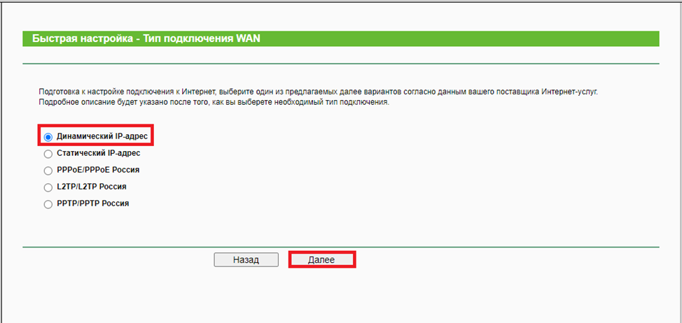 Из приведенного списка выберите «Динамический IP-адрес» и нажмите «Далее»;